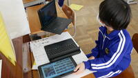 お休みの子とオンラインでつないで相談しながら作成したり、自分たちで撮った写真を貼り付けたりとタブレットが大活躍