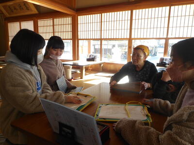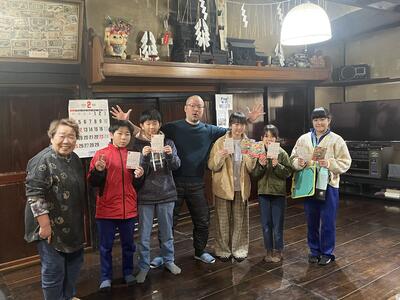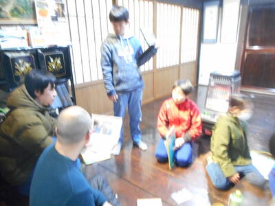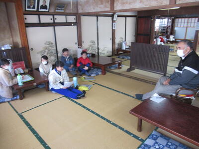 大内宿の本家扇屋さんで取材をしていた5・6年生。