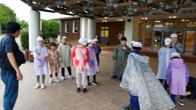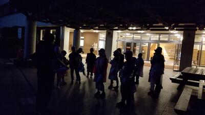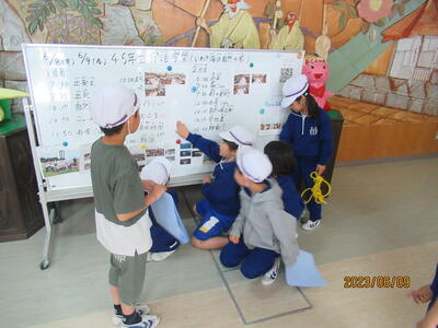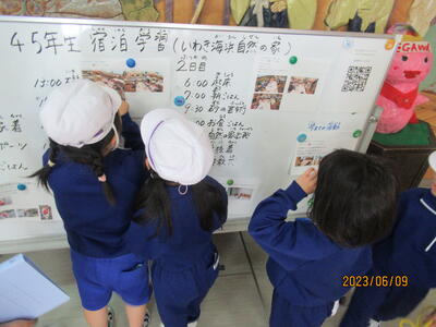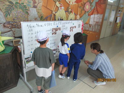 学校では,本校職員の発案で,正面玄関に宿泊学習のお知らせコーナーが設置されています。お留守番の子供達は,興味津々,みんなで楽しく見ています。