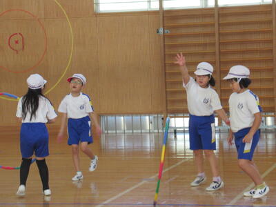 1・2年生は、フラフープを使った運動をしていました。自分たちで工夫して運動するというとても知的な体育でした。
