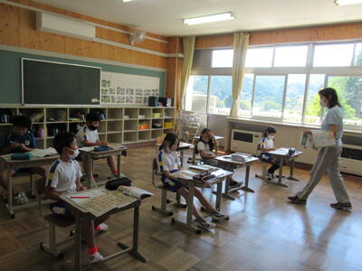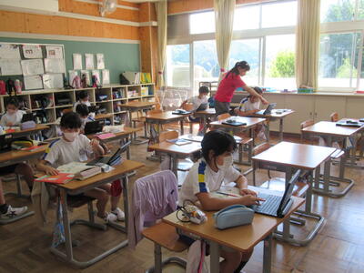 4年生は、漢字の学習。ただ、漢字を書くだけでなく、難しい言葉をインターネットで調べて、その写真を見て、漢字の定着を図っていました。この時は「砂丘」を調べていました。