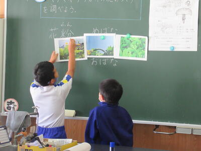 5年生は理科。写真の花がめばなか、おばなかを当てる学習をしていました。実際に畑で育てているヘチマの写真なので、子供たちはより、興味をひかれていました。