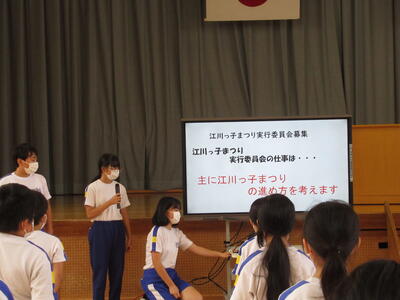 代表委員の6年生から、江川っ子まつり実行委員の募集がありました。