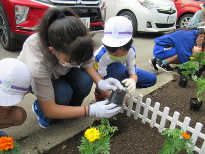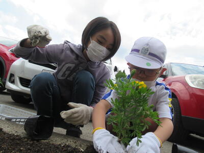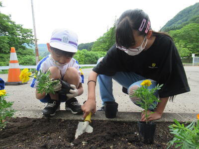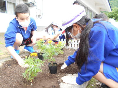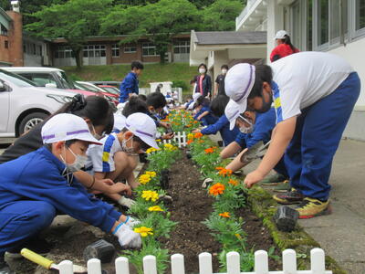 梅雨の晴れ間を利用して、全校生でマリーゴールドの苗植えを行いました。