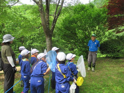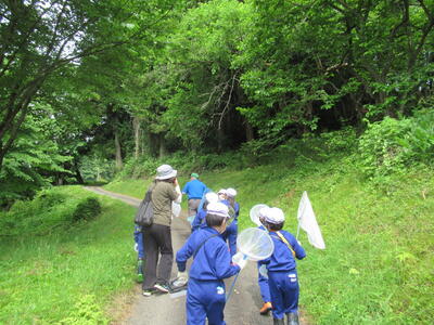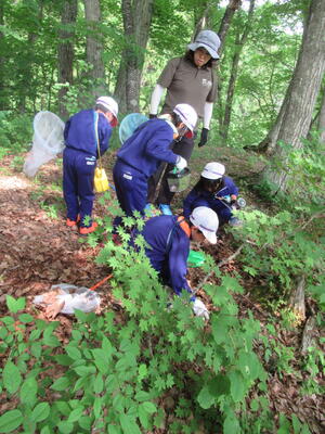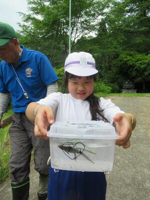 生き物を水槽や虫かごに捕まえた、子供たち。