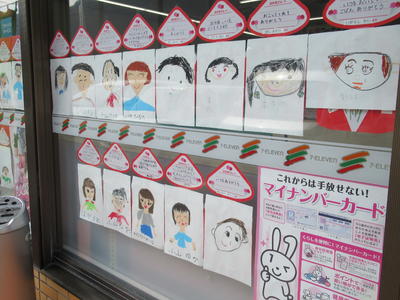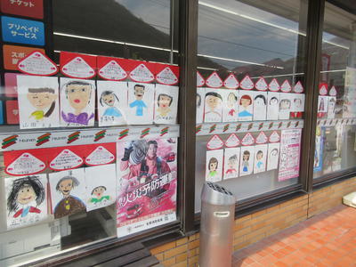 母の日に向けて子どもたちが描いた絵がセブンイレブン下郷湯野上店に飾られています。