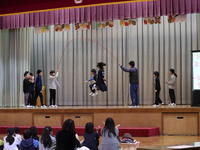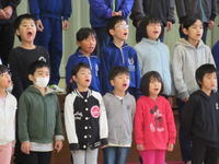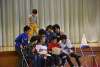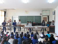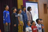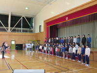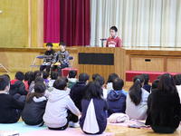 2019年11月29日 13時28分合奏クラブの児童(と先生)が、クラブ活動の時間に練習してきた曲を全校生に向けて発表しました。