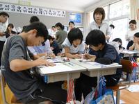 この日は、毛筆の魅力に触れ、点画のつながりや筆順、字形、字配り、文字の中心をそろえて書くなど、専門性を生かした毛筆の書写指導をしていただくことがねらいでした。