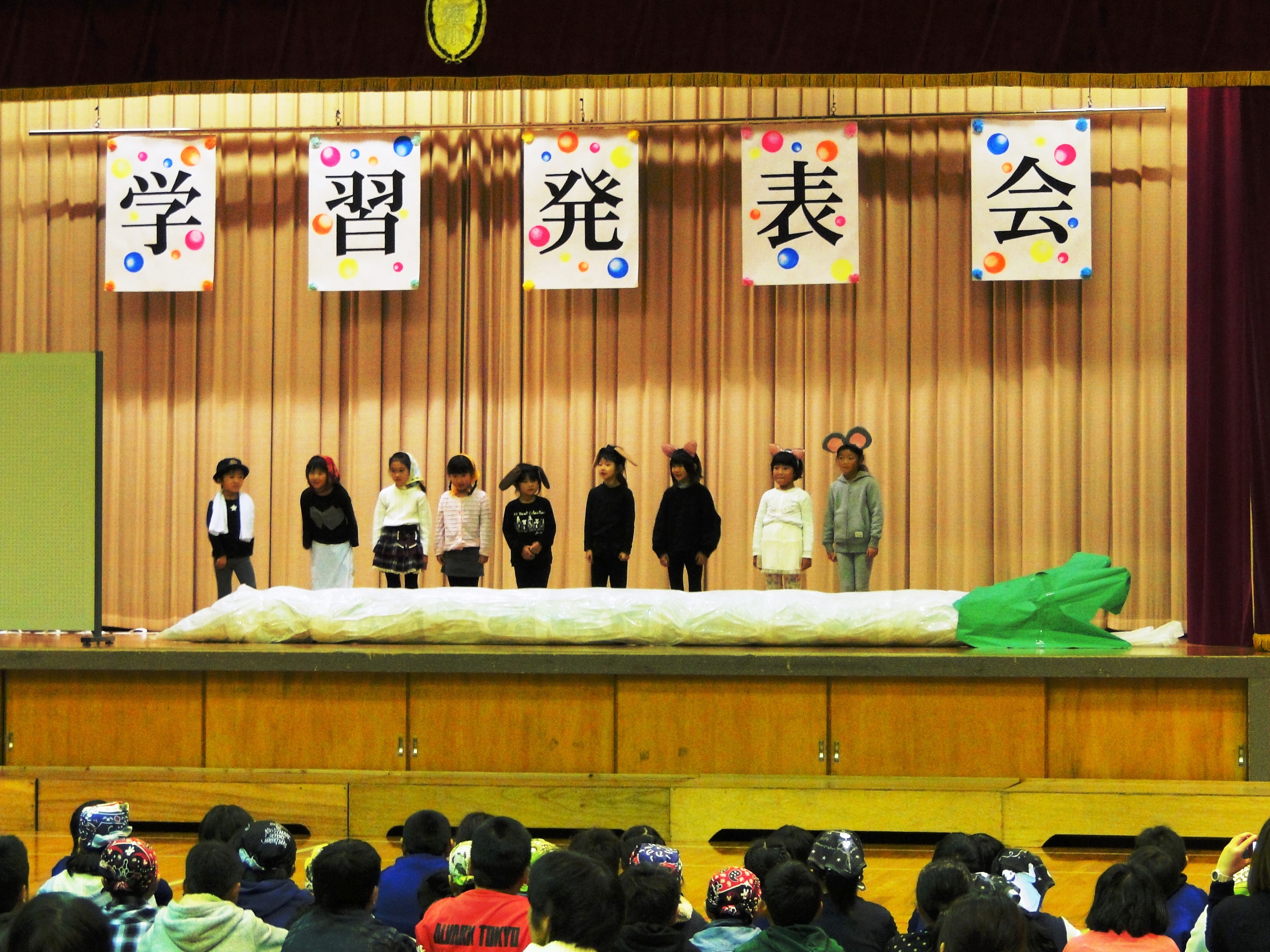最初の発表は1年生でした。1年生は、国語科の時間に学習した「大きなかぶ」をアレンジして劇化し、ダンスを加えて楽しく一生懸命な発表を見せてくれました。かわいらしい1年生が、力を合わせて引っ張っていたものは・・・。