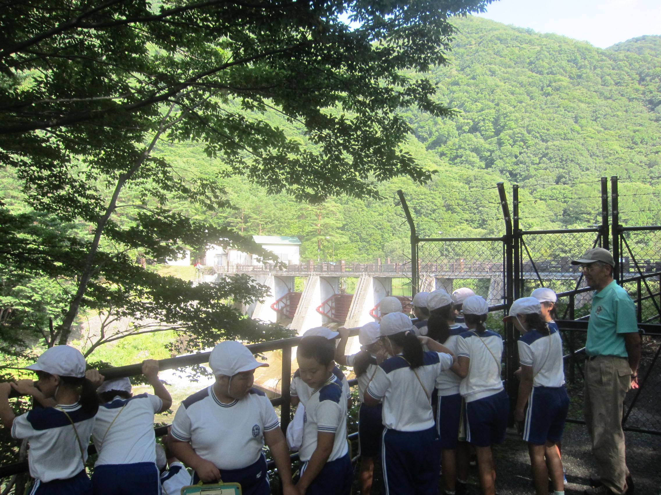 学校を出発した4年生は、まず鶴沼川ダムへ向かいました。ここでは、下流にある鶴沼川発電所との関係など、ダムの様々な役割について教えていただきました。このあと見学する芦ノ原の棚田に引かれる用水路との関係なども教えていただきました。