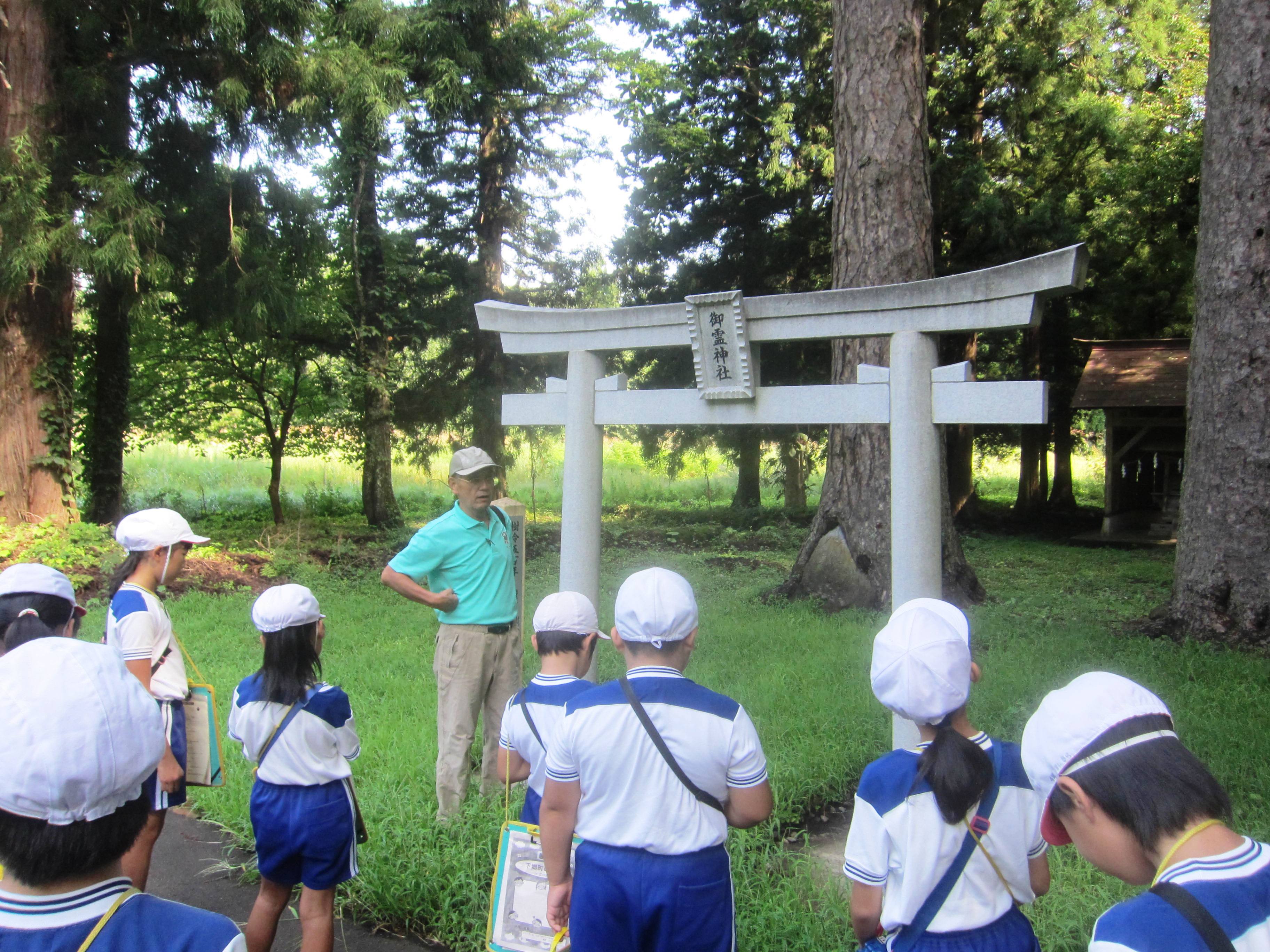 次に訪れた五霊神社では、鳥居の後ろに、もう一つ鳥居があるかのような大カラマツが2本そびえ立っていてびっくりした4年生でした。なんと、この大カラマツは樹齢500年であり、神社や御神木などの森林を大切に守ってきた地域の人々の思いなども教えていただきました。