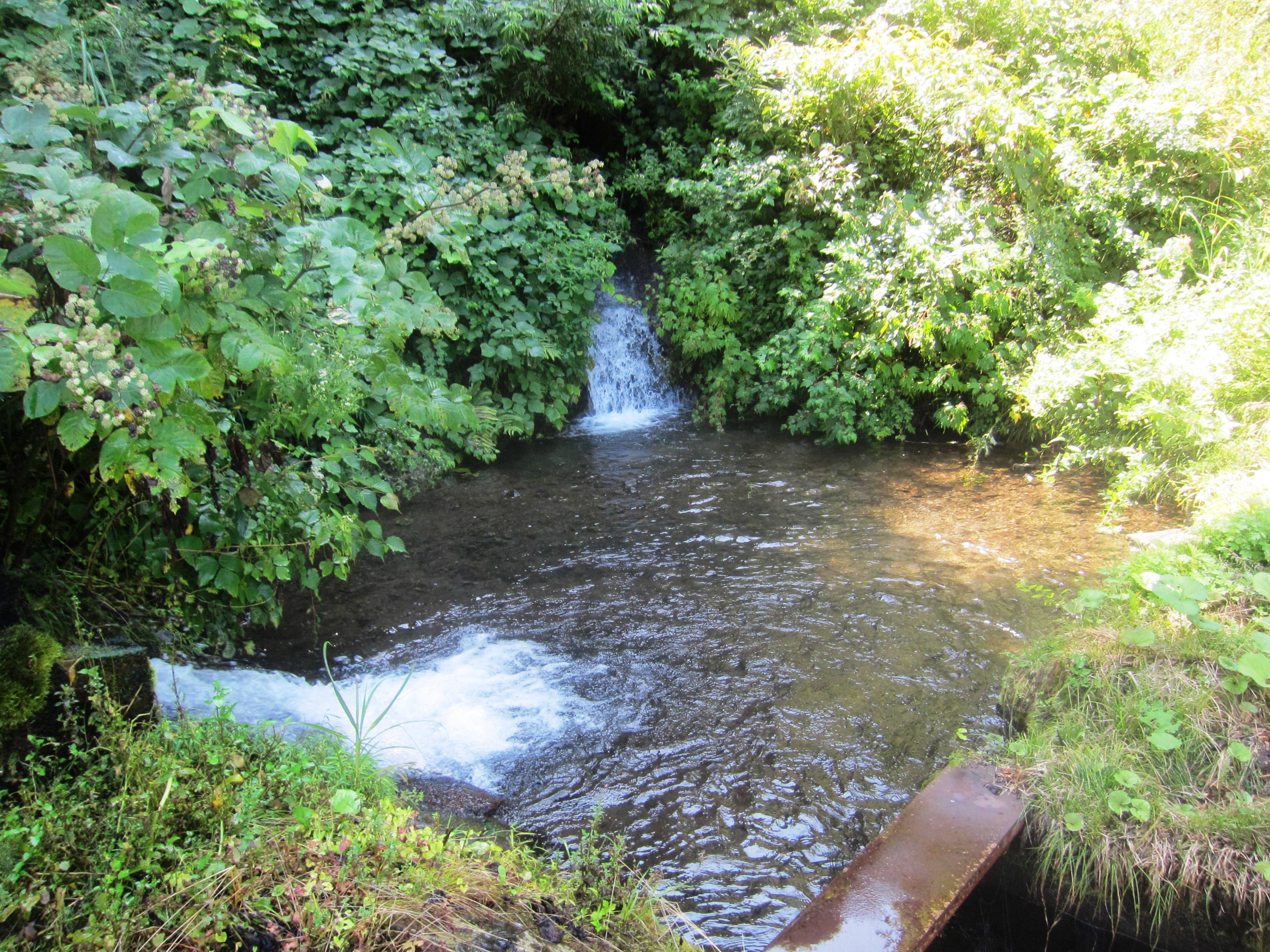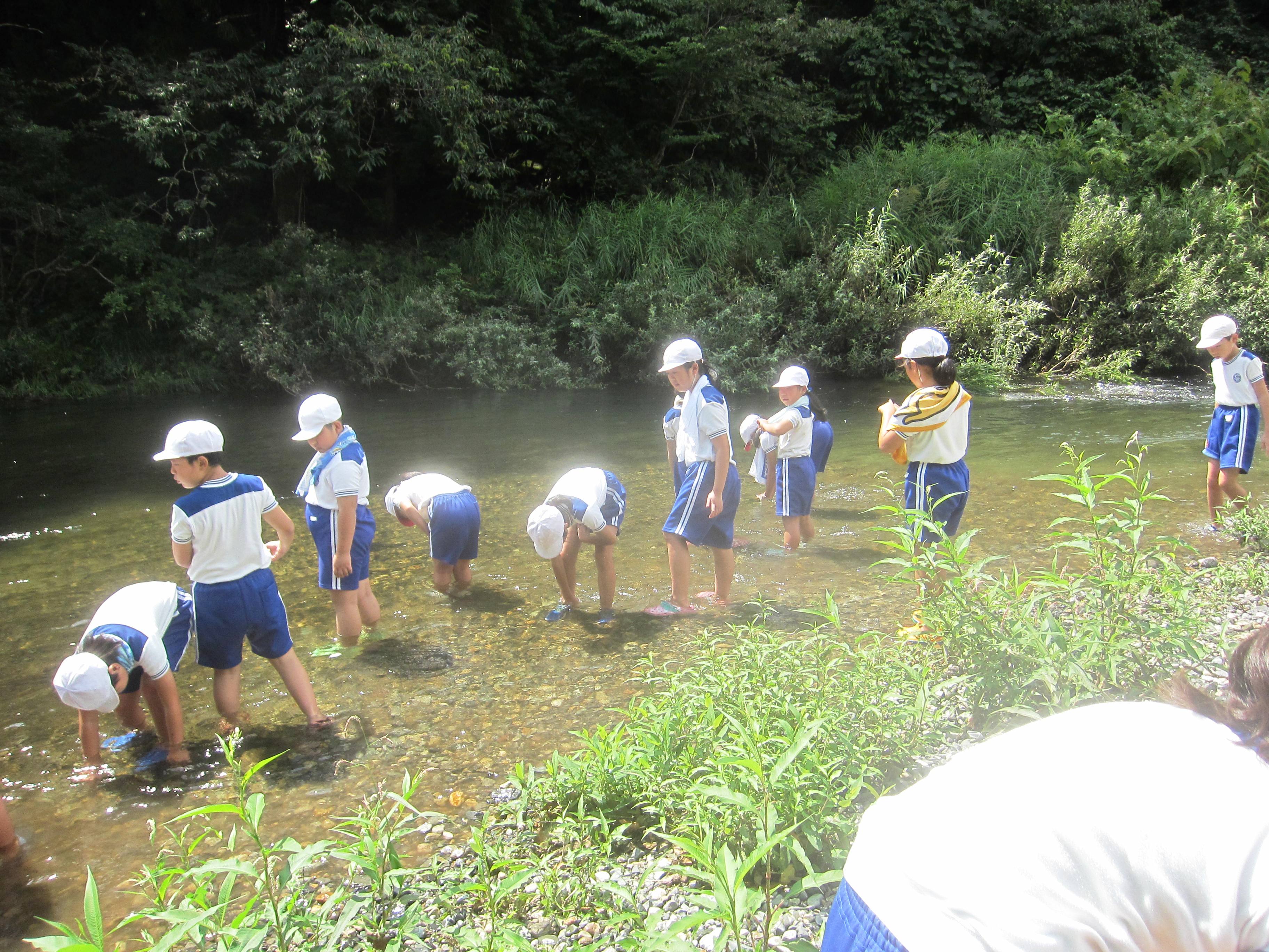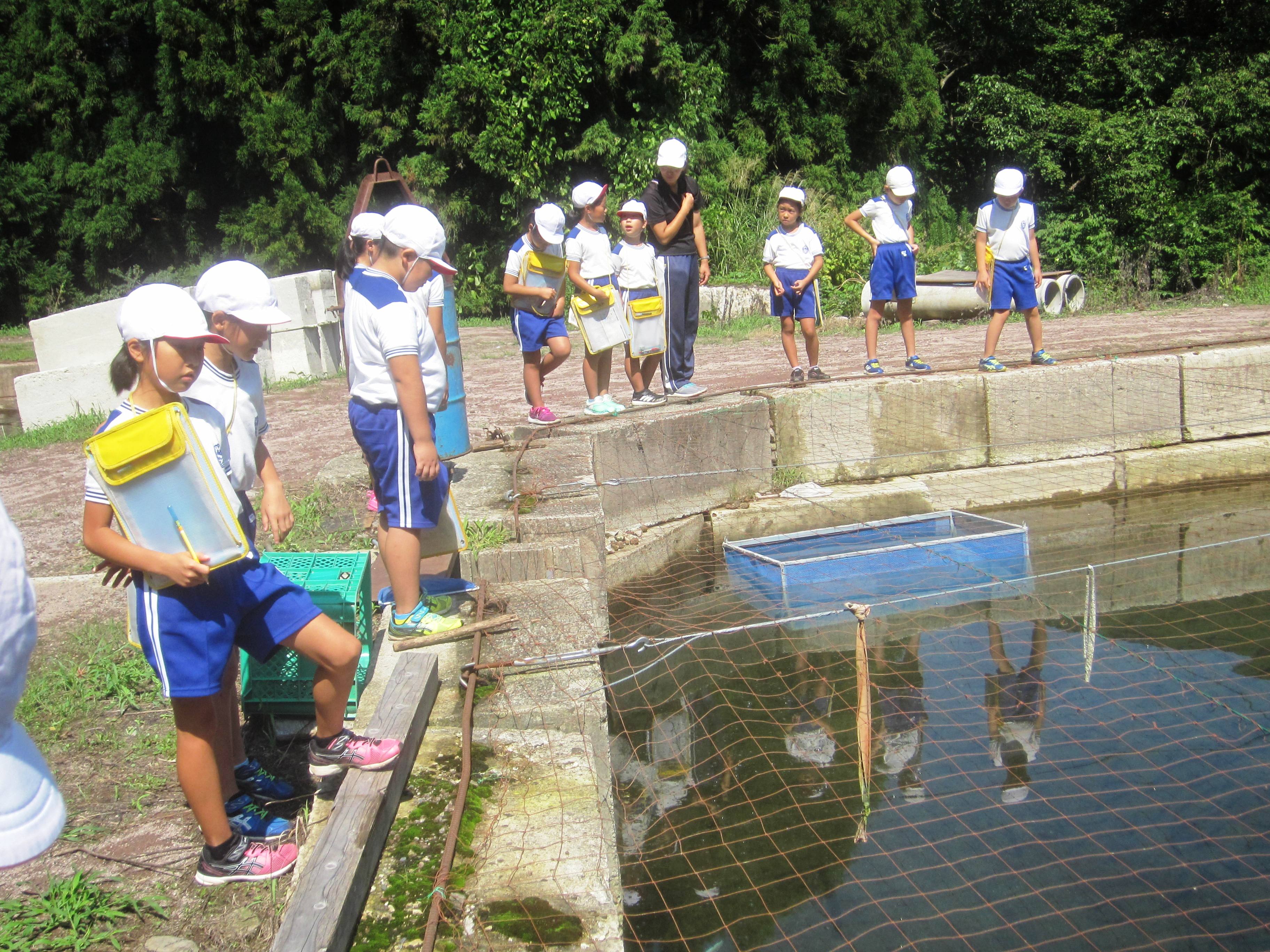 次に、養殖場の豊富な水源となっている鶴沼川、その上流にある中小出の滝(やじろが滝)を見学しました。保水力豊かな森林から湧き出る地下水から川ができていることを知り、自然の素晴らしさを改めて感じた4年生でした。川原でちょっと水遊びをしました。川の水は冷たくてとっても気持ちが良かったです。