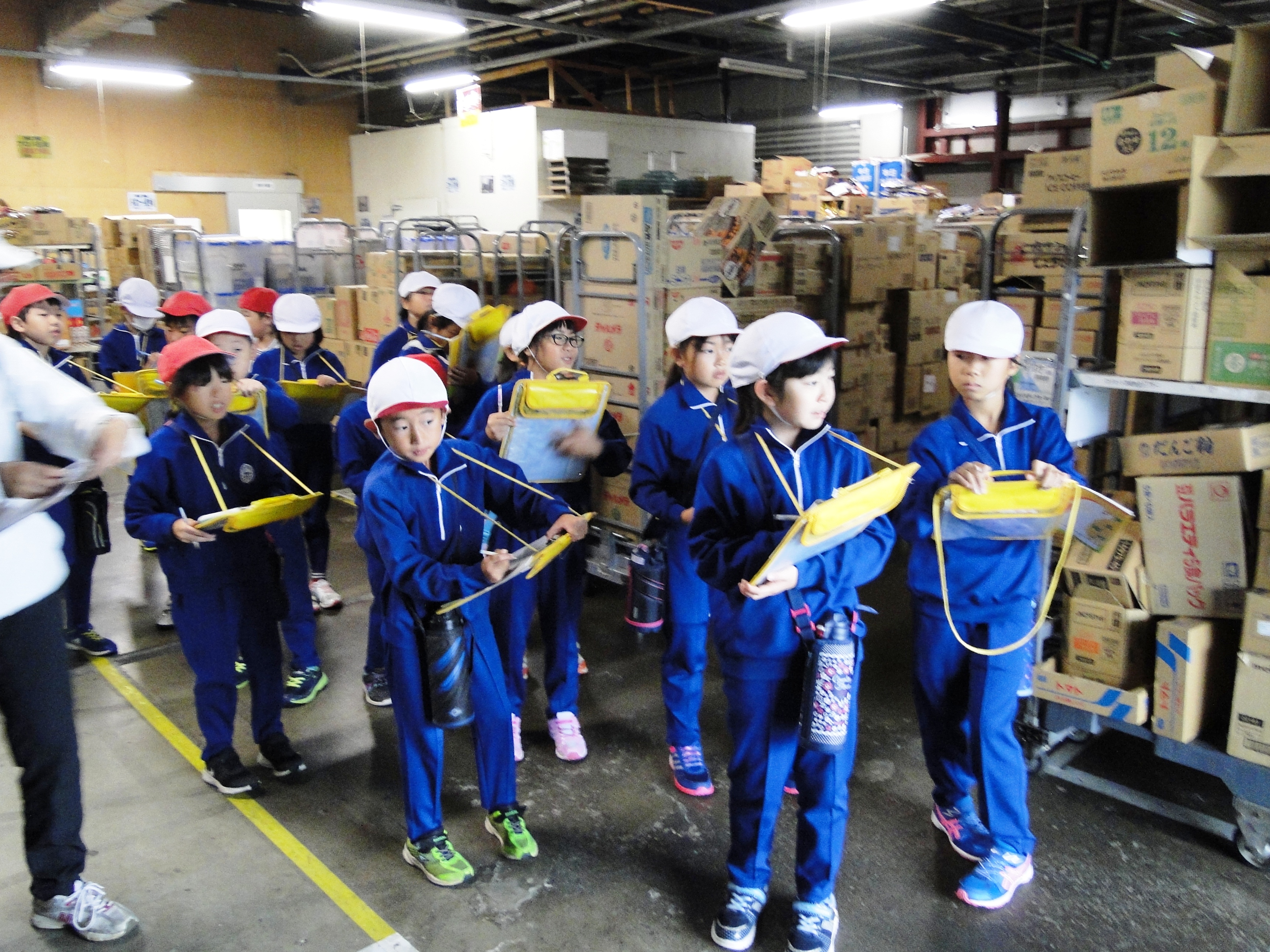 この日は、普段見ることができないヨークベニマルの裏側「バックヤード」を見せてもらいました。事務室を見学させていただいたり、お魚やお肉、お菓子や雑貨など、いろいろな荷物になったつもりで、30余りもある部屋の中を見学させていただいたりしました。副店長さんに説明してもらったことを、みんな一生懸命にメモしていて感心させられました。