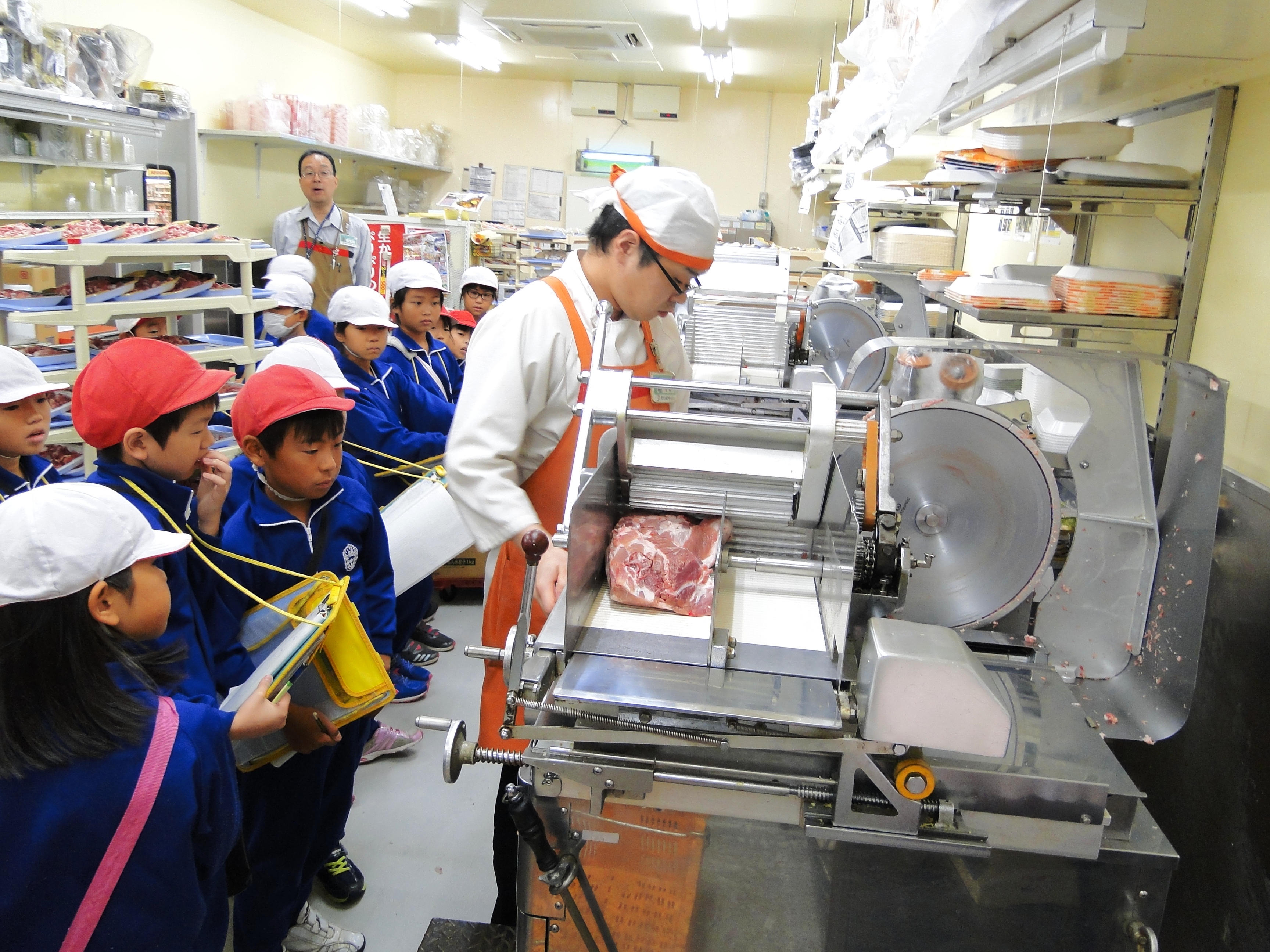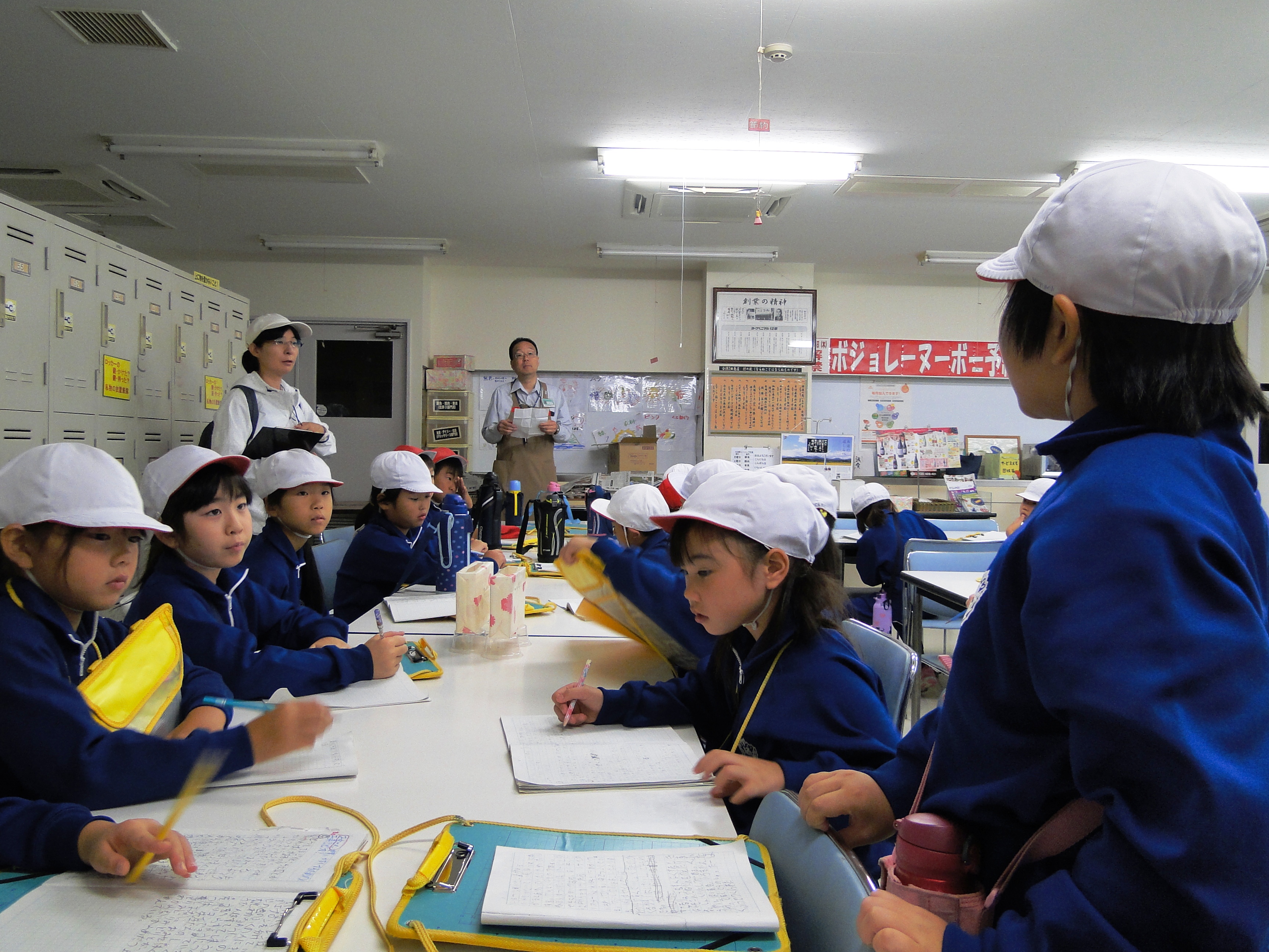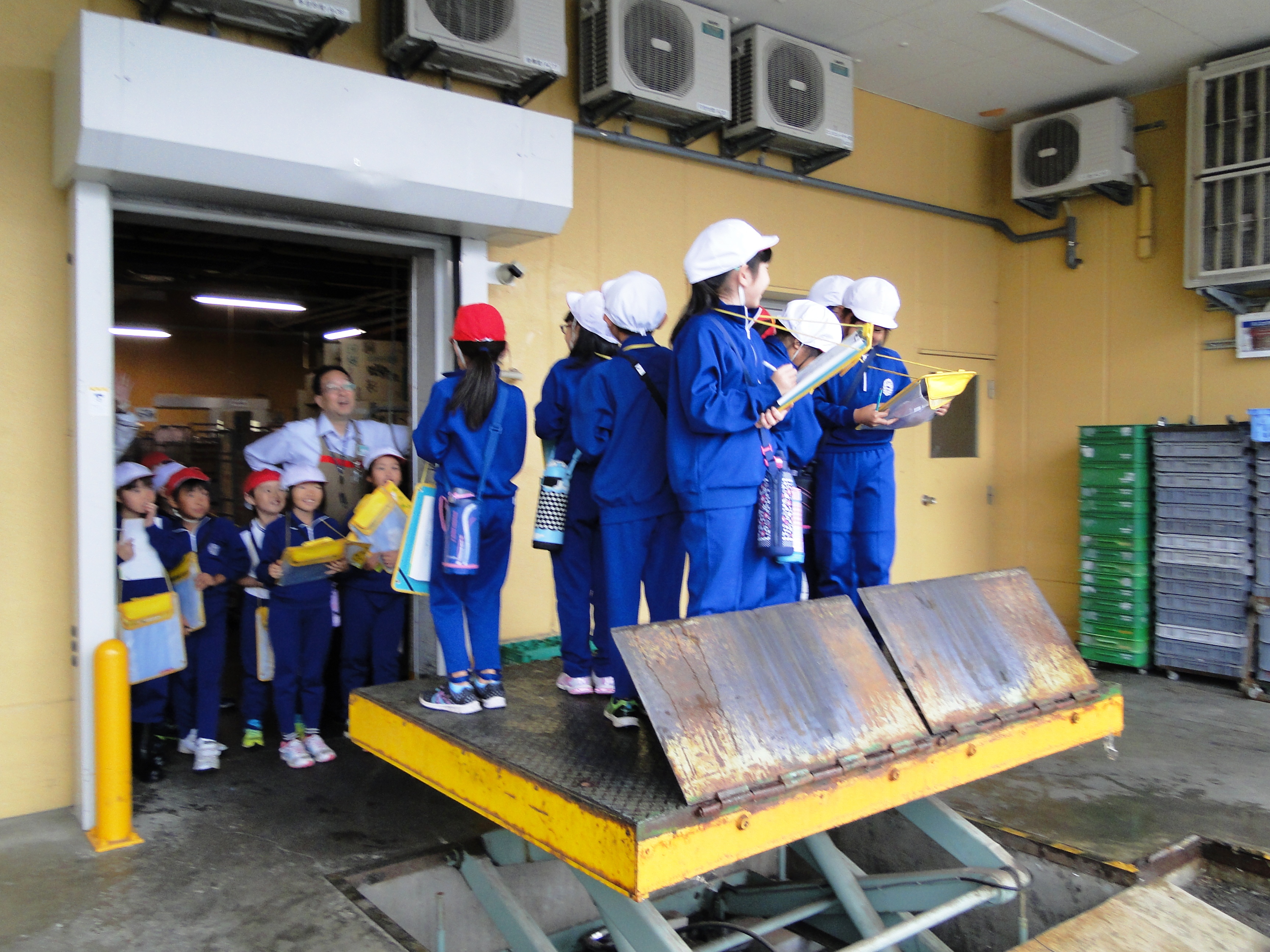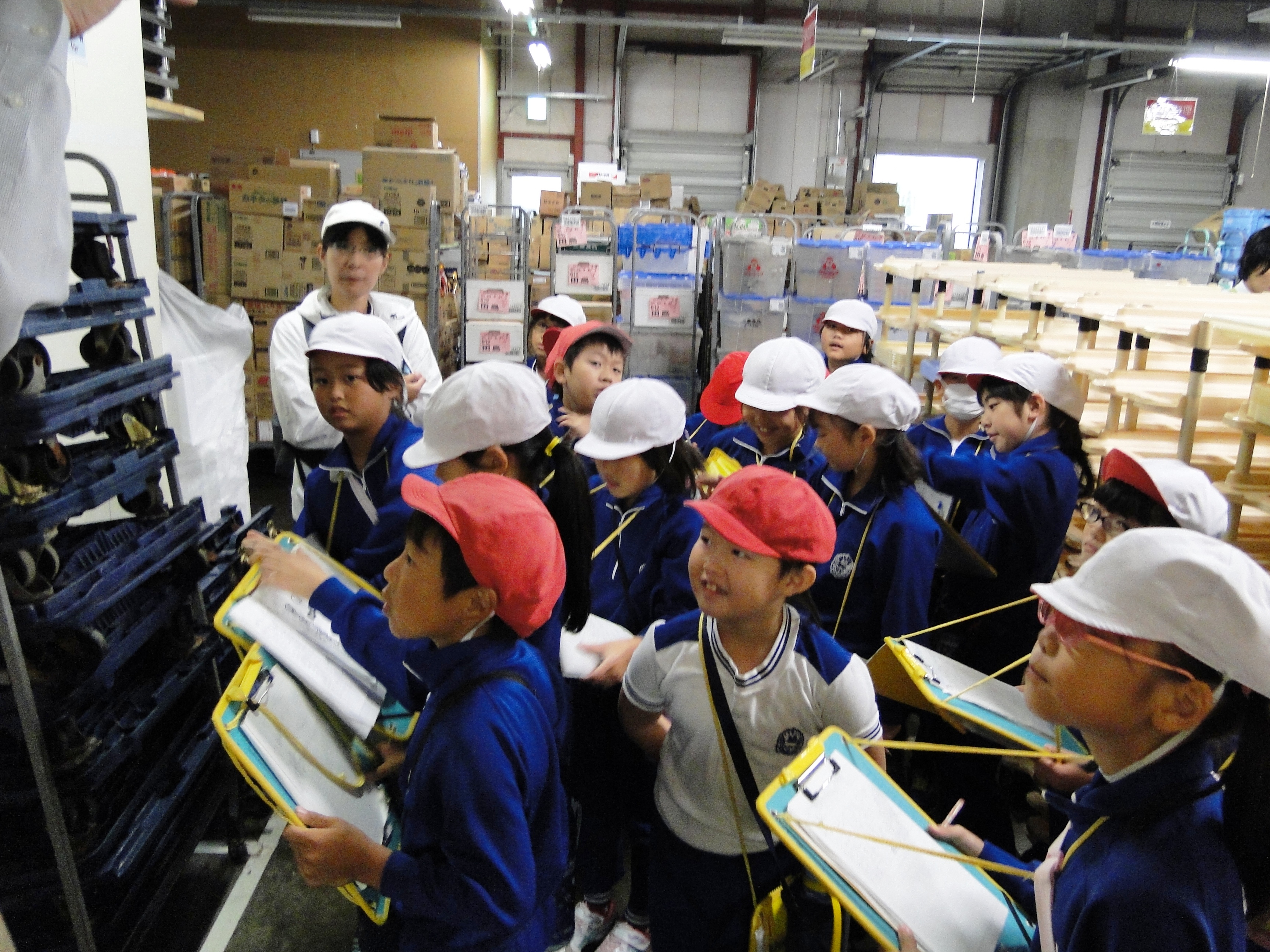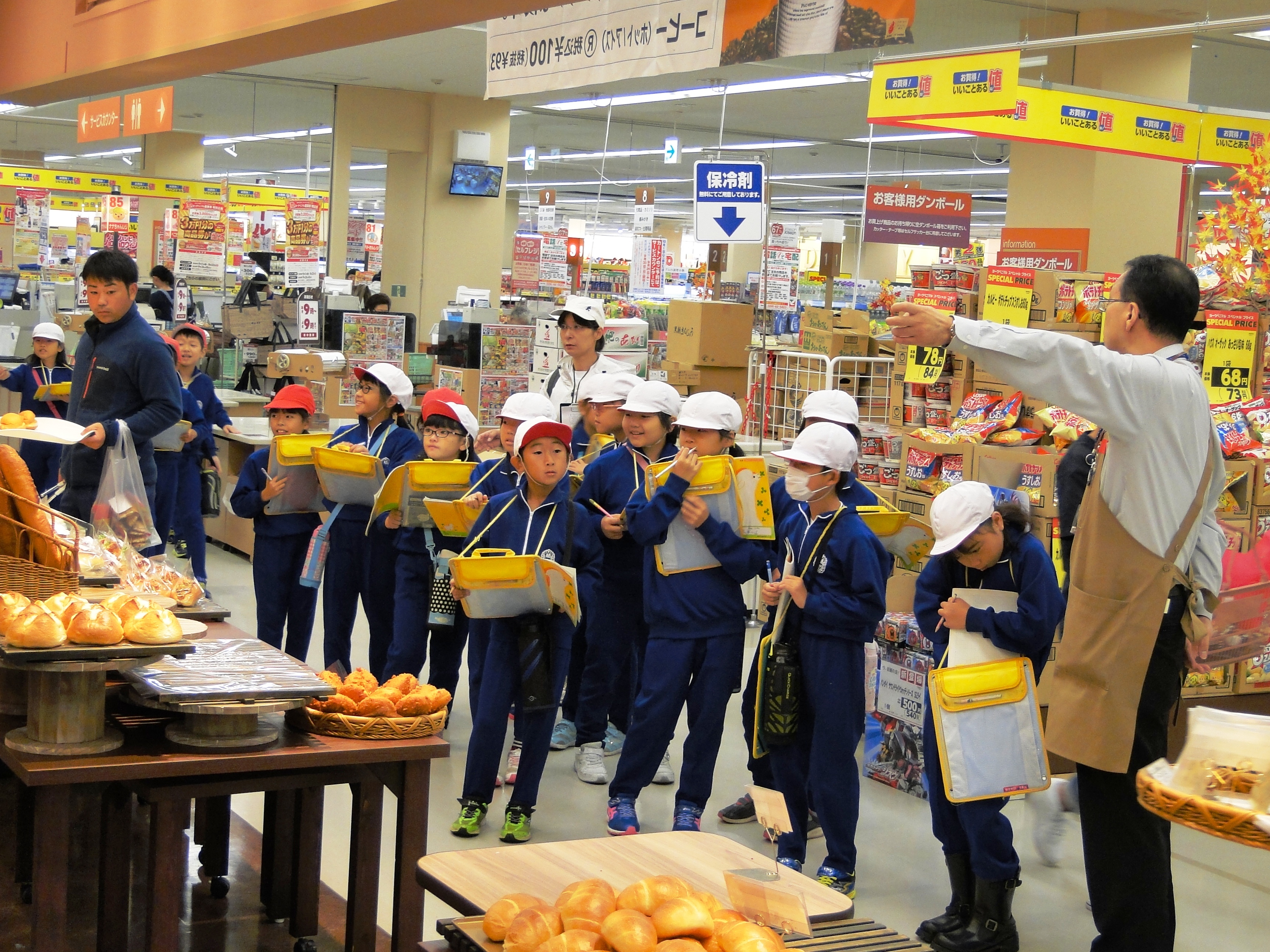 見学の後、案内していただいた副店長さんに、いろいろと質問をしました。次から次へと質問をする3年生。エプロンは部門ごとに色分けされていること。商品は、真ん中の棚に売れ筋の商品を陳列すること。天候や曜日に合わせて惣菜を作ること。お店の入り口には野菜や果物のコーナーを作り、季節感つを感じてもらえるようにしていることなど、工夫がいっぱいあることを教えてもらいました。