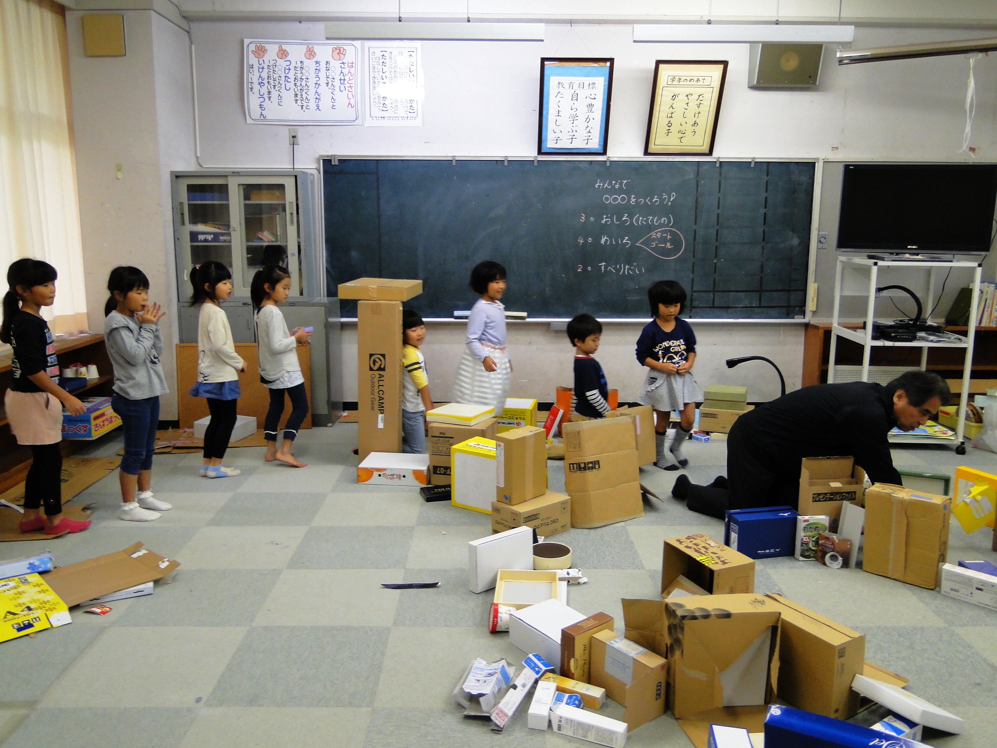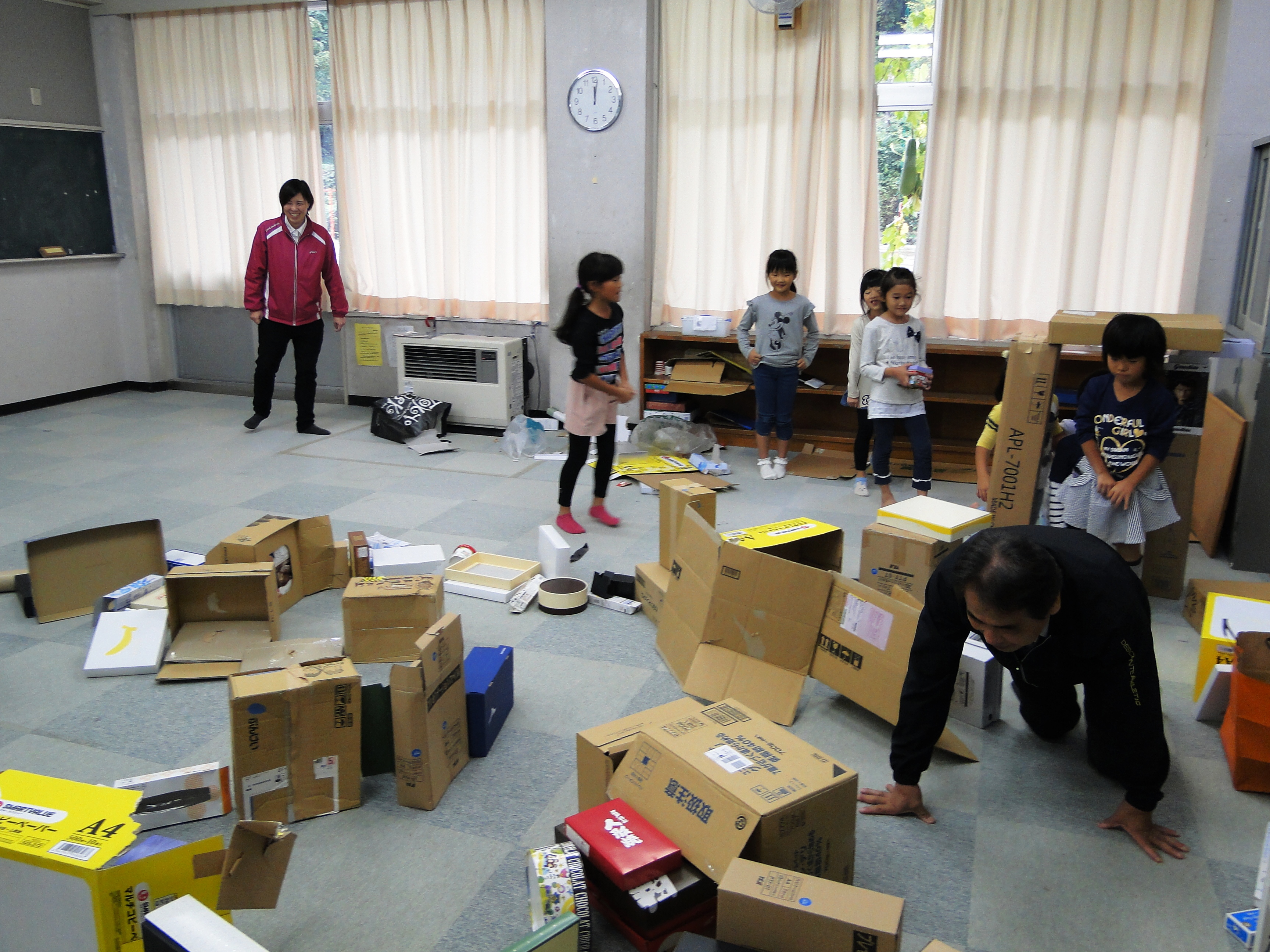 2018年9月27日 19時27分27日(木)、1年生が図画工作の時間、空き教室一面を使って、段ボールや持ち寄ったいろいろな
