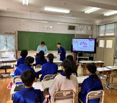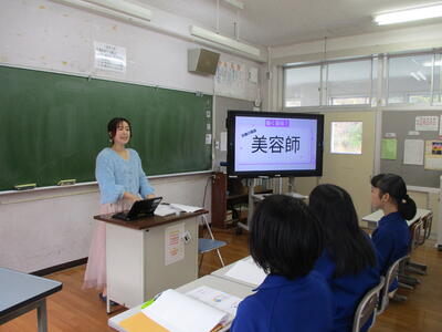 11月20日(月)に総合的な学習の時間「キャリア教育」の一環として、会津若松市にある美容室「プランタン」の「加藤 はるな」様を招聘し、職業講話をしていただきました。