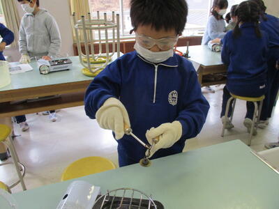 4年生の理科では、「ものを温めたり冷やしたりすると体積はどうなるか」について考えています。今日は、金属です。金属の玉をお湯や火で温めたり、水で冷やしたりして、輪を通るか調べました。火やお湯を使うということで、安全面に十分に気をつけながら、班で協力して、実験に取り組んでいました。