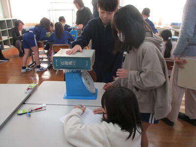 3年生の算数科で研究授業を行いました。重さの単位と測り方についての単元です。身の回りのものを、どのくらいの重さになるか予想し、はかりをつかって、実際の重さを測りました。予想と近い重さに喜んだり、予想よりもだいぶ軽いことに驚いたりしながら、体験を通して学びを深めました。