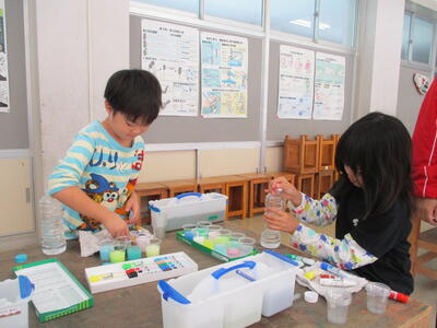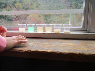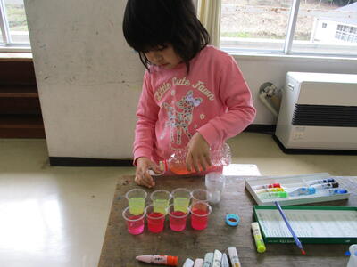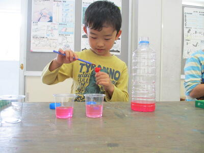 濃いもの、薄いもの、いろいろな色の絵の具を混ぜ合わせたもの・・・。いろんな色の水ができました。