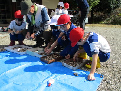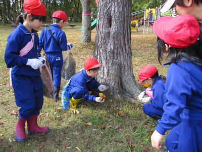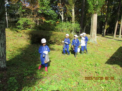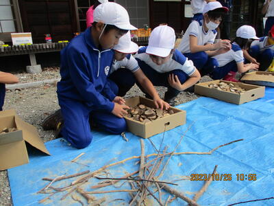 2023年10月27日 14時35分講師の方3名をお迎えして、公園周辺の木や木の実、小動物等について教えていただきました。その後、いろいろな大きさの小枝を使って首飾りや置物などの木工工作活動を行いました。天気にも恵まれ、大変意欲的に活動を行うことができました。