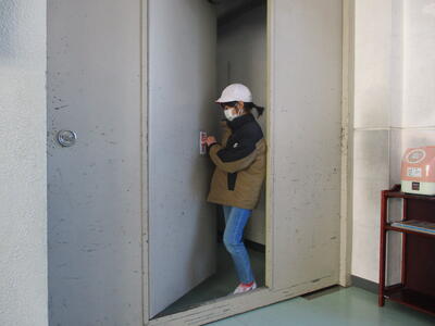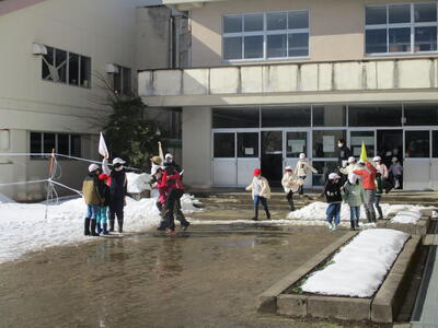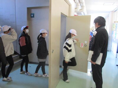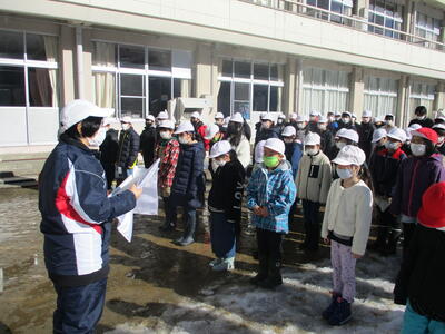2023年1月12日 11時04分今回は積雪時の避難方法を確認しました。二次避難に備え、防寒着を着用して素早く校庭に避難することができました。その後、防火扉の使い方を体験しました。放送による全体会では、5年生が「防火の呼びかけ」を行い、全校児童に注意を促しました。