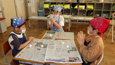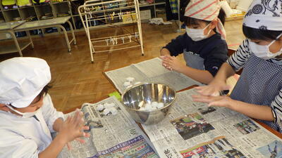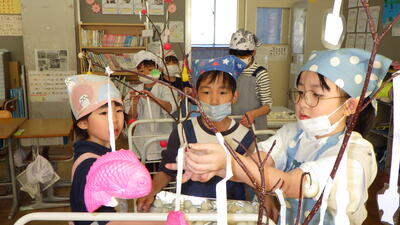 2023年1月13日 16時33分生活科の時間に、「団子さし」を行いました。団子さしの由来について話を聞き、その後、2つのグループに分かれ、団子を作りました。丸めた団子を茹でてもらっている間にみず木の芽をとったり、魚や野菜、ひょうたんなどの飾りを付けたりしました。最後に、ゆであがった団子を付けました。