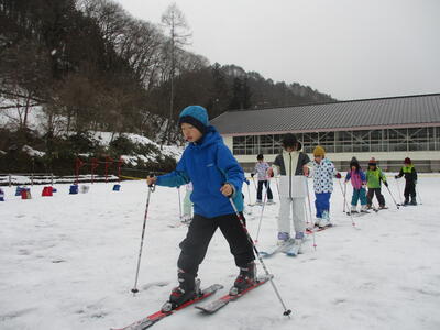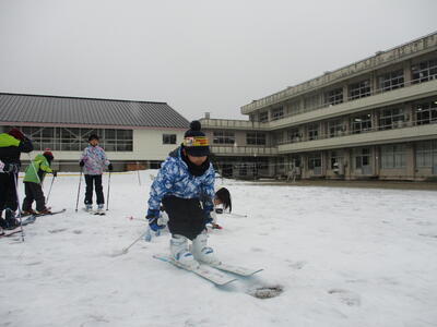 2023年1月18日 11時35分1年生の体育は、校庭でスキーの練習でした。2月のスキー教室に向けて、スキーを履いて歩いたり、方向転換をしたりと、基本的な動作を確認していました。4年生の図工は、木版画を行いました。初めて彫刻刀を使うため、彫刻刀の種類や用途を実際に試して確認していました。