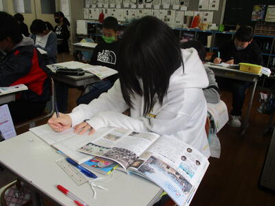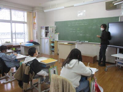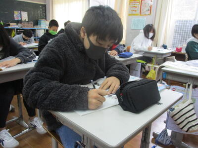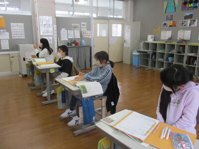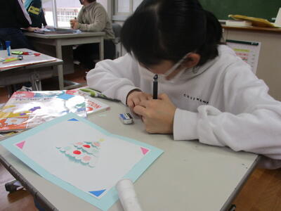 2022年12月14日 11時31分1・2年生のブロック体育は、縄跳びでした。ペアで回数を数え合いながら真剣に取り組んでいました。5年生の外国語は、クリスマスカード作成でした。折り紙や色鉛筆を使って素敵なカードを作っていました。6年生の社会は、明治維新の単元でした。真剣に話を聞き、教科書を見ながら大切な内容をノートにまとめていました。