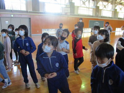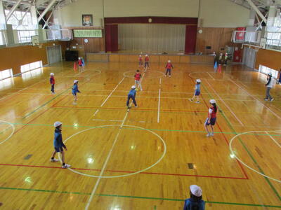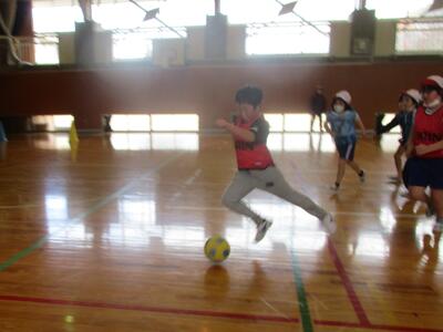 2022年11月16日 11時46分行事が一段落し、子供たちは授業に意欲的に取り組んでいます。1年生の書写では、筆に水をつけて文字を書く毛筆の練習です。自分の名前を丁寧に書いていました。3・4年生の体育はサッカーです。男女混合チームで仲良く楽しそうに試合をしていました。