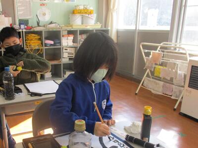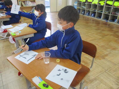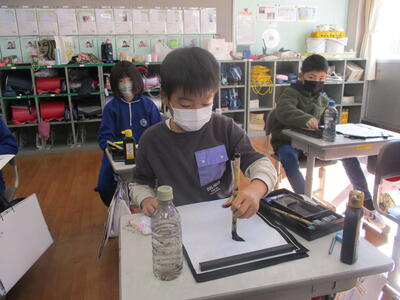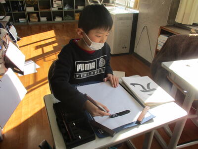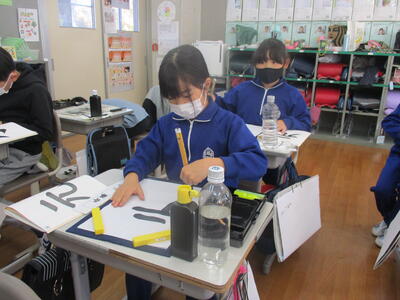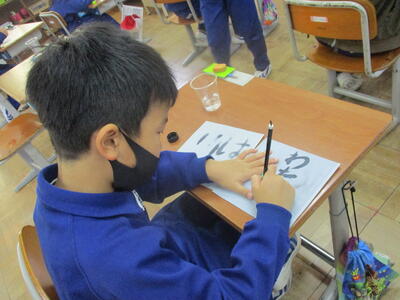 2022年11月10日 10時46分書写の学習に集中して取り組んでいます。「はらい」や「曲がり」などの書き方も学び、だいぶ毛筆にも慣れてきました。12月になると書き初めの練習が始まります。書写を通して、字をていねいに書くことの大切さを学んでほしいです。