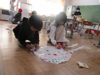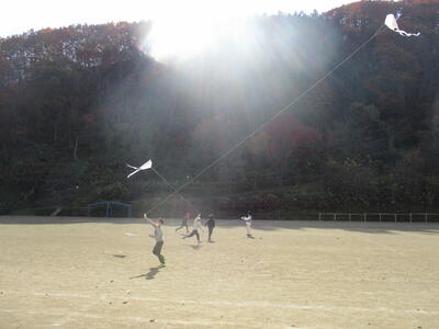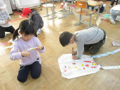 2人1組となり、好きなイラストを描いた後、早速、校庭へ。揚げる人・持つ人と交代しながら、みんなで凧あげを楽しみました。