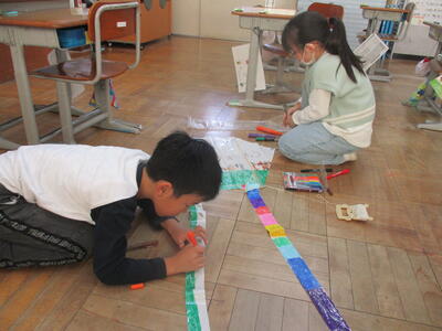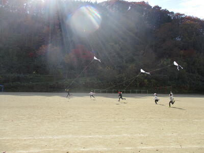 2022年11月11日 13時27分冬の遊びとして、「凧」を作り、「凧あげ」をしました。楢原小学校の校庭は、冬になると雪で使えなくなってしまうので、思いっきり校庭を走ることができるこの時期に行いました。
