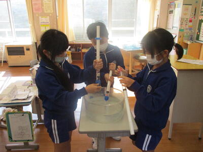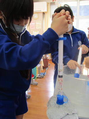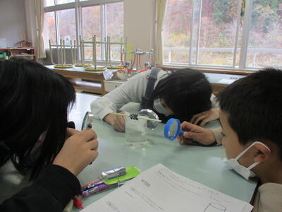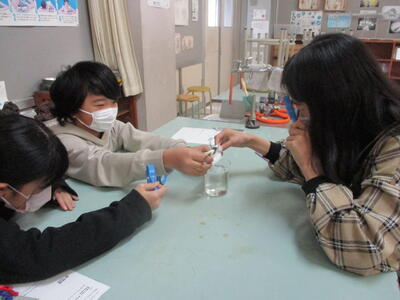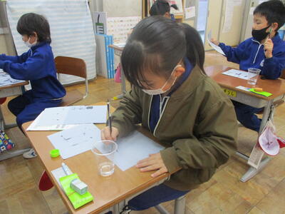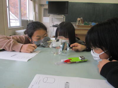 2022年11月15日 10時31分「物が水に溶けるとは?」について考えます。実際に食塩を水に溶かしてみました。塩を水に入れた瞬間に「じわ~」と溶けだす様子を見て、「油みたいに出てきた!」「溶けたものが輪っかみたいになった!」などの感想を述べながら、とても驚いていました。次時からさらに「溶ける」に迫っていきます。