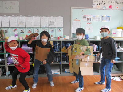 2022年11月17日 11時52分3年生の男子が朝や休み時間を使って、何やら段ボールで工作をしていました。ついに完成したというので、何を作ったのか聞いてみると、「ガンダム!」だそうです。どの辺がガンダムなのかわかりませんが、楽しく工作する姿はいいですね。ガンダムになりきってポーズ!!