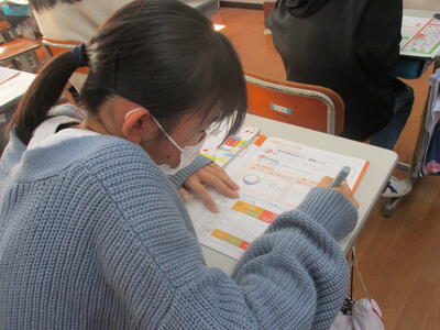 2022年10月31日 12時43分家庭科の授業で「1食分の献立」を考えました。「主食」「主菜」「副菜」「汁物」のそれぞれの料理を考え、5大栄養素を考慮しながらバランスのよい献立を考えました。どんな食材を使って料理を作るかを考えたり、旬の食材を採り入れたりと、主体的に取り組みました。