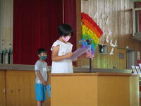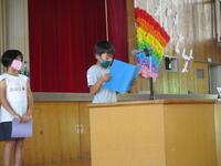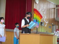 その後、2、4、6年生の代表児童が作文発表を行いました。1学期の取り組みを振り返り、夏休みの抱負を述べました。