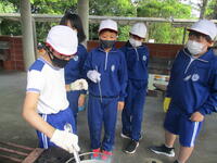 2021年6月30日 11時55分6月30日水曜日、1年生の生活科の授業で、シャボン玉を使った学習をしました。太陽の光に反射して、シャボン玉がきれいな虹色に光っていました。