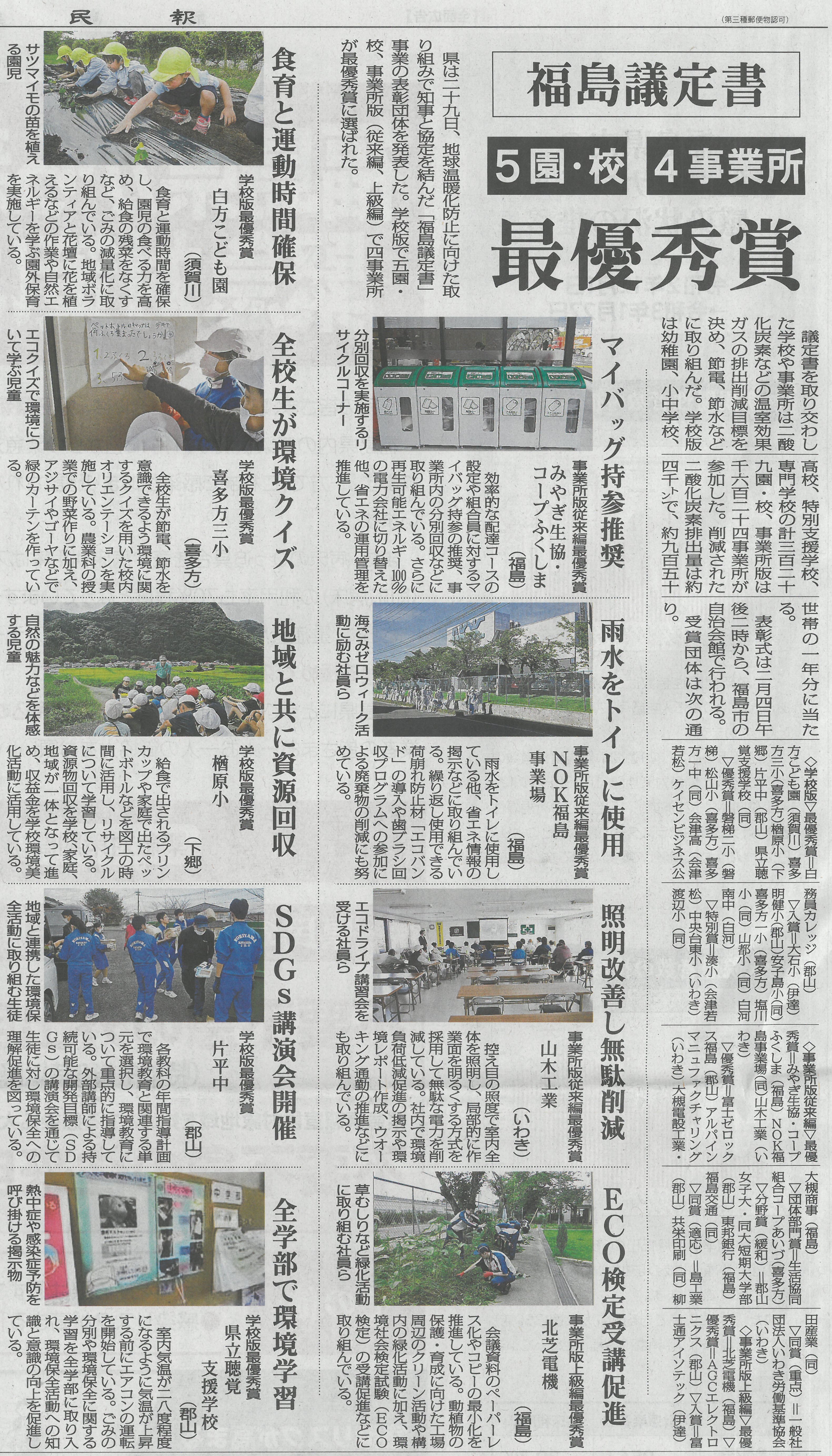 2021年2月1日 06時09分1/30付けの各新聞に掲載されましたので、すでにご承知のことと思いますが、温暖化防止に向けてみんなで取り組む「福島議定書」事業において、今年度の本校の成果が認められ、福島県内にあるたくさんの小中学校のうち、4校の1校(他:1園)に選ばれ、「最優秀賞」をいただくという快挙を成し遂げました。