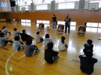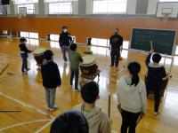 4年生の「和太鼓」体験では、始めに基本的な構え方やばちの持ち方を指導していただきました。