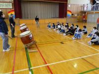 同じようにやってみると、構えるだけで格好よく見えるようになっていた4年生でした。また、和太鼓の打ち方をていねいに教えていただきました。