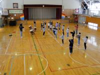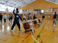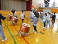 2021年2月18日 12時37分18日(木)、大川渓流太鼓保存会の岩澤修さんと玉川健一郎さんを講師として招聘し、和太鼓をたたく体験をしました。