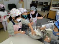 家庭科室へ移動した子どもたちは、先生から団子づくりの手順を聞いた後、両手でこね、みんなで協力して丸め、たくさんの団子を作りました。お話をしないで、気持ちを込めながら一生懸命に団子を作る1年生。手のひらを上手に使ってまん丸く丸めることができました。白い団子なので、紙粘土みたいに思えたようで、星の形や餃子の形などを作り始める子どもたちも見られ、とてもほほえましい雰囲気の中で活動が行われていました。