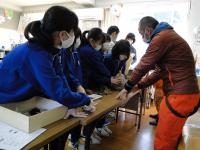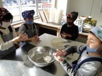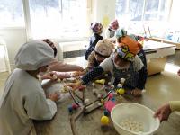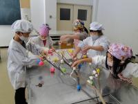 小正月に色とりどりの飾りや団子を、みず木(団子の木)にさして飾る年中行事の一つであり、新年の「豊作祈願」「一家繁栄」「無病息災」「豊かな幸せな生活」などの願いが込められていることを教えてもらいました。その後、身支度を整えて家庭科室へ移動。エプロン姿で、マスク越しに見えるうれしそうな目元にほんわかしました。