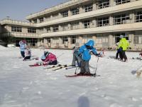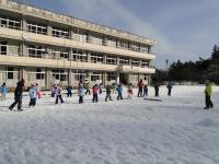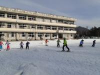 今年度、スキー場へ行ってスキーをすることは行いませんが、1・2年生では体育科の学習において、スキー靴を履く、スキーにスキー靴をはめる、スキーを履いて歩くなど、雪国に生まれた子どもたちにスキーの体験をさせてあげたいと考え、校庭で学習を行ってきました。もちろん、学習前後の手洗い・うがいの徹底と、ソーシャルディスタンスに配慮しながら・・・。