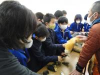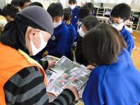 まず出発前には、講師の阿久津さんより、南会津地方の野山に生息する野生動物の種類や足跡の見分け方、冬超しの様子を教えてもらいました。4年生は、写真や資料、実際に熊と出くわした話などに驚いた様子で聞き入っていた。