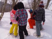 この日は天候にも恵まれ、観音沼の景色はとてもきれいでした。かんじきを履いて散策しながら、桜の冬芽やうさぎが食べた木の幹などの観察することができました。他にも、全員が沼の周囲や丘の上を歩いて、雪原に残ったうさぎやテン、リス等の足跡の形や進む方向、うさぎの寝床等を観察することができて、とても貴重な学習となりました。