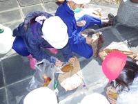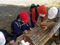 散策後、木工クラフトを行いました。拾った木の葉や木の実に絵を描いたり、色を塗ったりして枝に張り付けながら、班ごとに作品づくりをしました。木の葉や木の実から想像を膨らませて、思い思いに作品づくりに夢中になる子どもたちの姿が見られました。班ごとにオリジナルな作品を完成させて喜んでいた子どもたちでした。