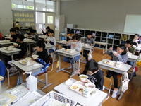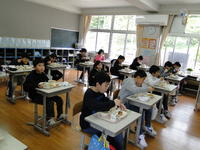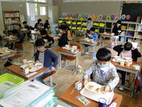 感染予防対策として、当面の間、給食の時はグループで向かい合って食べることはできませんが、給食の時の子どもたちの表情はみんな笑顔でした。