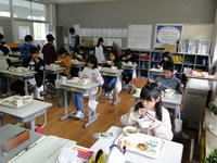 主食は紫黒米でした。今、健康食品として注目されている紫黒米は、アントシアニンと呼ばれるポリフェノールが豊富に含まれ、白米に比べ食物繊維やミネラルも豊富な食材だそうです。体の調子を整える栄養素がたくさん入っていて、臨時休業明けにはぴったりでした。地産地消の食材である豆腐を使った「揚げ豆腐」や糸こんを使ったサラダなど、1食分のカロリーが計算された各おかずを味わっている子どもたちの姿がありました。切り干し大根が入り、ふわふわ卵がいっぱいの「にらたま汁」も、おいしかったです。