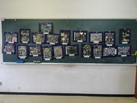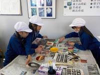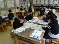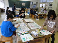 図工室では4年生が、木版画の学習をしていました。この日は、刷った紙に、裏から彩色していき、カラー版画風に仕上げて、2020年のカレンダーに貼る最後のところの学習でした。画風・色合いなど、各作品に一人一人の思いが込められていて見事でした。